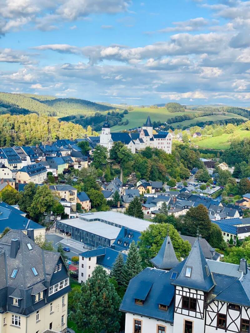 Seit 20 Jahren bin ich sowohl musikalisch, künstlerisch als auch im Sinne der psychologischen Profession unterwegs, um ein kleines bisschen heimatliche Geborgenheit zurückzugeben. Immer einmal wieder zieht es mich daher zurück, sodass ich stets auch überlege, was ich neues und relevantes gestalten kann, um die Perle des Erzgebirges mit meinem kleinen Anteil strahlen zu lassen. Am 23. September war ich zum 20jährigen Klassentreffen unseres Abi-Jahrgangs back in Town, und in besonderer Weise durfte ich auf den höchsten Turm meiner Schule, um wohl eine der schönsten Perspektiven auf die tolle Altstadt von Schwarzenberg samt Schloss und Kirche zu genießen.