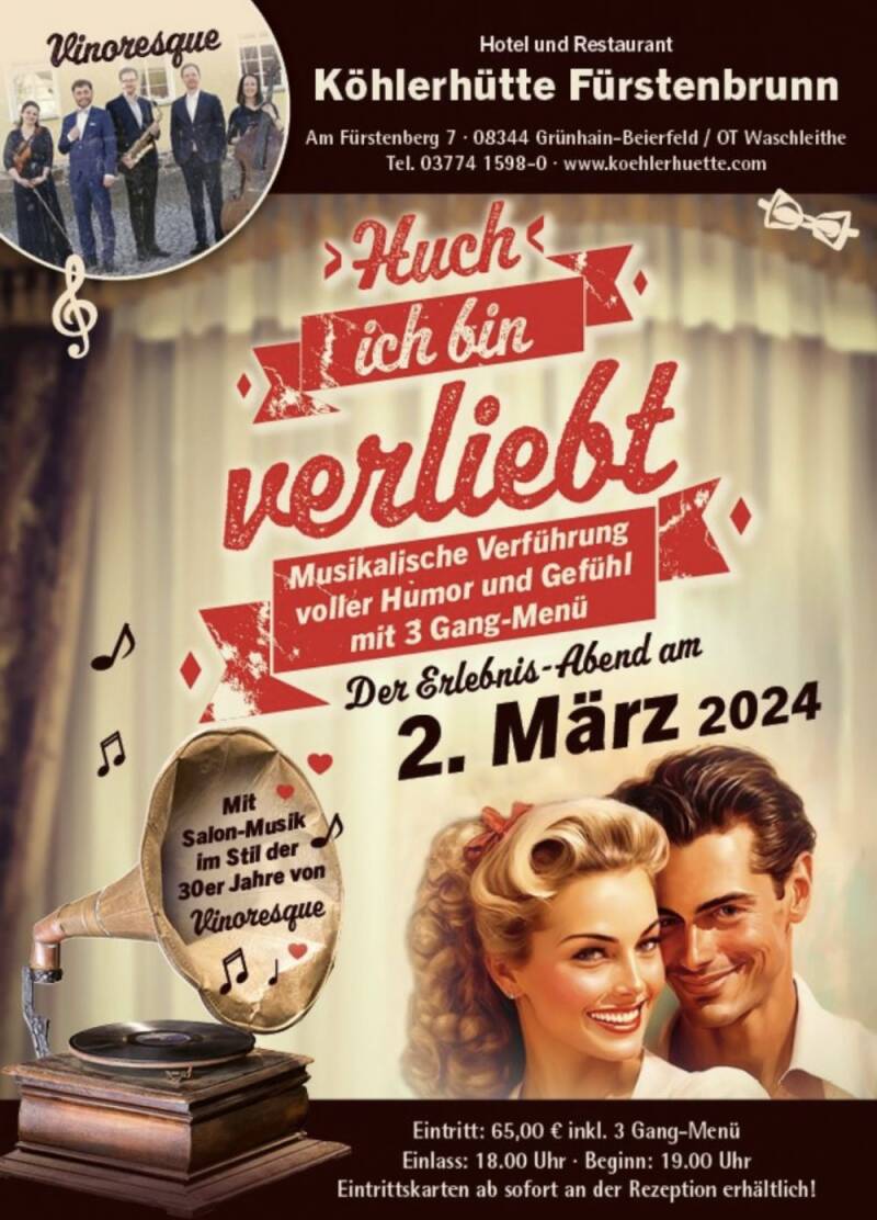 Ganz in diesem Stile sollen auch 2024 Lieder der Goldenen 20er und 30er Jahre erklingen, instrumental und gesanglich. Im Stile dessen, was man von dieser musikalischen Hoch-Zeit kennt, gepaart mit einem Augenzwinkern versehene Moderationen werden die zwei Damen und drei Herren bekannte und unbekannte Lieder erklingen und Frühlingsgefühle entstehen lassen. Liebe ist etwas, das zwischen zwei Menschen entsteht, oder eben zwischen Publikum und „Vinoresque“, sodass jede/r einzelne/r am Ende fühlt: „Huch, ich bin verliebt“. #vinoresque#hotelkoehlerhuetteerzgebirge #frühling #frauentag#frauentagskonzert